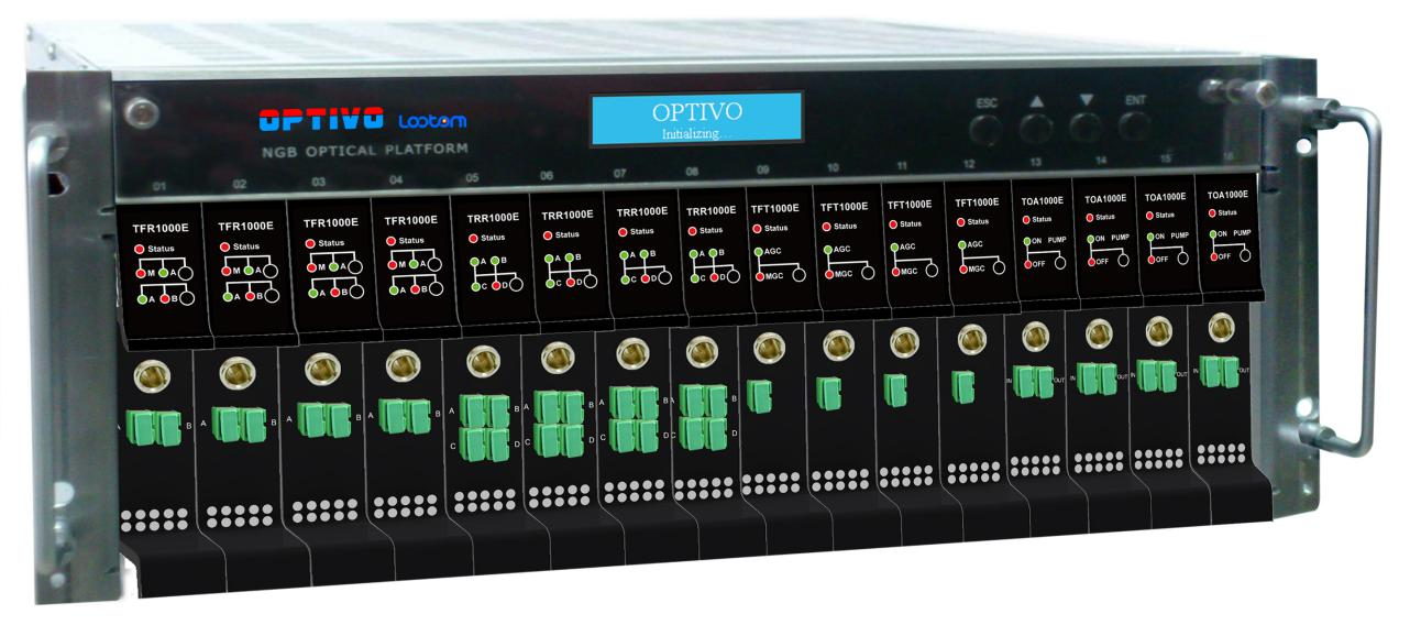 Overview        OPTIVO optical platform is an high density, high reliability, intelligent optical platform, which is specially designed for HFC network transmission center room head-end and sub head-end. 4RU standard rack provides 16 slots for application modules, including forward optical transmitter module(TFT1000E), forward optical receiver module(TFR1000E), reverse optical transmitter module(TRT1000E), reverse optical receiver module(TRR1000E), headend amplifier module(TFA1000E) and 1550 EDFA module(TOA1000E), 1550 direct modulation module(TFT1550E),optical switch module(TOS1000E),RF switch module(TRS1000E). All application modules can be hot-swappable and comply with national standards, SCTE HMS and IEC Network Management System to achieve intelligent management.